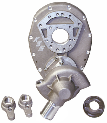 A VERY SIMPLE way to outfit your Motor with the BR Water Pump and Front Cover Kit. The heart of this Kit is the KSE Water Pump featuring their New Style Impeller, which increases water flow by up to 20%. This is mounted to a Billet Aluminum Stand with the Lexan Timing Window installed. This awesome new kit also comes with the Billet Aluminum Water Pump Drive that is Hard Anodized Black. The next feature is the Standard Aluminum KSE Front Cover with multiple Oil Pump Flange Bolt Pattern to make plumbing easy. Also installed in the Front Cover are Water Pump Studs. Last but not least are the Water Fitting Adapters that bolt to the Water Inlets on your Block. A Really Nice Kit At A Price That Saves You $$$.