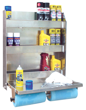 FEATURES FOLD DOWN Table with Paper Towel Holder, 3 Shelves for Storage. Top Shelf holds 9 Aerosol Spray Cans. 24” Wide, 30” High, 5–1/2” Deep.