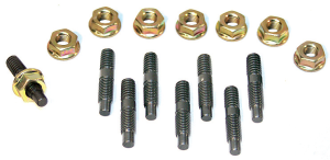 SPECIALLY DESIGNED STUDS 1/4 NC on the Bottom, 1/4 NF on Top, 1 1/4” long with a Special Non Thread Tapered Tip for alignment. Studs are heat treated and oxide finished. The Nuts have a Built-In Flange Washer with a 7/16 Hex Head. They are also Plated. Set of 8 Studs and Nuts. These Also Can Be Used As A Stud Setup For Oil Pans!