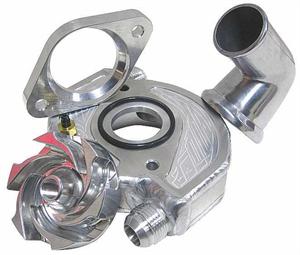 THIS IS THE real deal if you want to keep your Motor cool & make more power. The Ultimate Water Pump Housing & Impeller creates between 42-43 lbs. of block pressure. The Special Impeller is designed with Curved Veins to force water in a constant direction which limits cavitation. The tight machined tolerances make the Housing & Impeller the Best On The Market!! One thing that sets it apart from the competition is the Air Bleed installed at the top of the Housing. This is designed to let you bleed off any air in your Water System after it's completely filled up. Air in your Water System will cause uneven flow and low block pressure. Available for Center Mount Suction Radiators & the Standard Passenger Side Suction Radiators also. The Trick Swivel Neck on the Standard Style makes plumbing clean and fast. Installs onto KSE Water Pump Bases and just like always BR Motorsports has them in stock & ready to ship today. Get Your Water Pump Updated Today!!